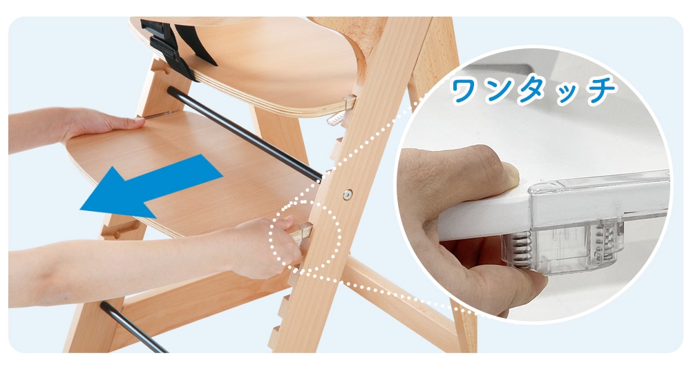 座面&足置き(ビックステップ)は、ワンタッチで取り外しできるので、お子さまの体格に合わせて、簡単に高さの調節ができます。