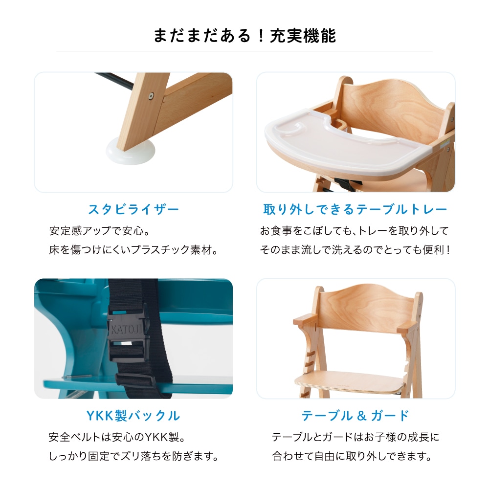 さらに、お手入れも簡単なのが嬉しいポイント。専用のテーブルトレイは、簡単に取り外せて、水洗いOK!日々の使用やこぼれ物も手軽に洗っていただけて、清潔さを保てます。忙しいママパパにも優しい設計です。デザインもシンプルで、どんなインテリアにも馴染むのでおしゃれな食卓を演出します。
